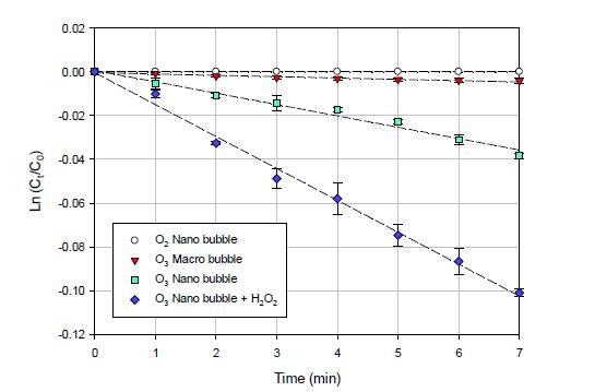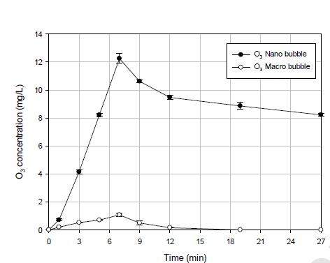 我們可以通過產(chǎn)生納米氣泡來增加氣泡的總表面積。較大的表面積意味著臭氧氣體從氣體轉(zhuǎn)移到水中的可能性更大。因此,我們比較了大臭氧和納米臭氧的臭氧傳質(zhì)(圖1)。從0到7分鐘,納米臭氧氣體向水中的傳輸速率(1.67 mg / L / min)比大型臭氧(0.17 mg / L / min)快9.8倍。由于其在水溶液中的耐久性,納米臭氧濃度的半衰期比大臭氧的半衰期高23倍。使用納米氣泡時,臭氧濃度的半衰期更長,可以用氣泡排斥理論來解釋。納米臭氧可以增強臭氧在水相中的耐久性。由于OH離子的選擇性吸附,納米氣泡在各種pH值下都帶有負電荷。由于H +(-1127 kJ / mol)的水合焓比OH-(-489 kJ / mol)的水合焓低得多,因此納米氣泡的帶電表面會產(chǎn)生排斥力。這種現(xiàn)象有助于避免氣泡合并。
