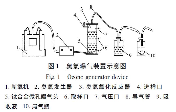03質量濃度38~60mg/L,出氣經過置于反應器底部的鈦合金微孔曝氣頭進入臭氧氧化反應器,以20g/L的硼酸為吸收液,啟動臭氧發生器后淀粉碘化鉀試劑開始變藍時計時,臭氧尾氣由碘化鉀吸收后排放。