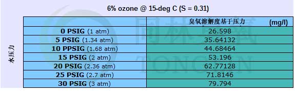 將水壓輸入溶解度計算為P.水壓力計算為大氣壓。0 psig = 1大氣壓= 14.7 psia。隨著對水的壓力增加,臭氧的溶解度增加。上表和下表是基于臭氧濃度為6重量%(85.8g / m 3)和15℃水溫的該計算的實(shí)例。這些是許多臭氧應(yīng)用的非常平均值。