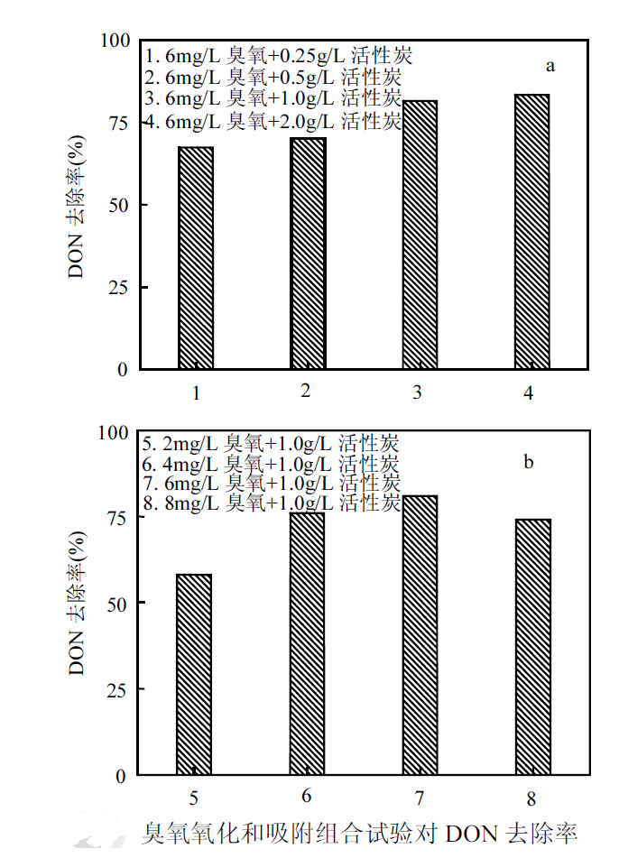 3.在臭氧氧化和活性炭吸附組合試驗中,DON 的去除率 很大可達 83.3%;臭氧投加量固定(6.0mg/L),隨活性炭投加量增加(從0.25g/L增加到2.0g/L),協(xié)同因子從1.15到1.09,表明此時臭氧/活性炭體系中存在著明顯的協(xié)同效應(yīng);當活性炭投加量固定(1.0g/L),臭氧投加量為2,4,6mg/L,協(xié)同因子分別為1.12、1.07 和1.10,臭氧/活性炭體系中也存在著一定程度的協(xié)同效應(yīng),臭氧投加量為8mg/L時,協(xié)同因子為0.97,系統(tǒng)無明顯協(xié)同作用.