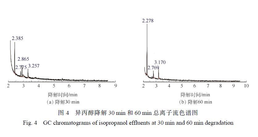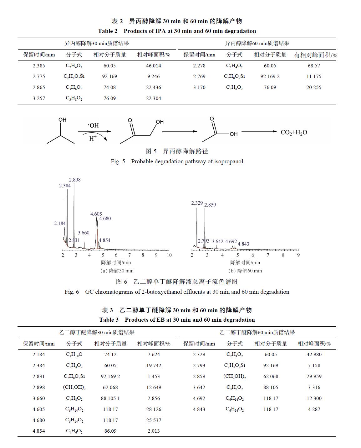 為了研究廢液的降解路徑,以廢液主要成分異丙醇和乙二醇單丁醚為例進(jìn)行探討,對(duì) 2種物質(zhì)進(jìn)行降解并對(duì)降解產(chǎn)物用GC/MS進(jìn)行檢測。