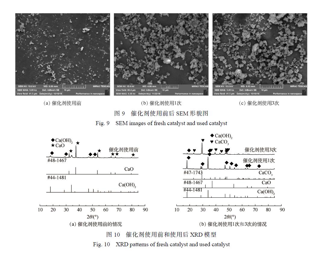 圖 10(b)為催化劑使用 1次和使用 3次后的 XRD圖。催化劑使用 1次后的 XRD譜圖在 2θ為18°、28.7°、34.1°、47.1°和 50.9°處存在較強(qiáng)的峰,這些峰與 Ca(OH)2的特征峰一致,表明其主要成分是 Ca(OH)2。而使用 3次的催化劑測出的 2θ為 23°、 29.4°、 39.4°、 43.2°和 47.1°對(duì)應(yīng)的峰 是CaCO3的特征峰,說明催化劑的失活過程主要是:經(jīng)過多次循環(huán)后的催化劑與水結(jié)合變成了Ca(OH)2,形成的 Ca(OH)2與礦化產(chǎn)物 CO2結(jié)合從而變?yōu)?CaCO3, 很終由于多次反應(yīng)后 CaCO3含量不斷增加從而導(dǎo)致催化劑催化效率逐漸降低。