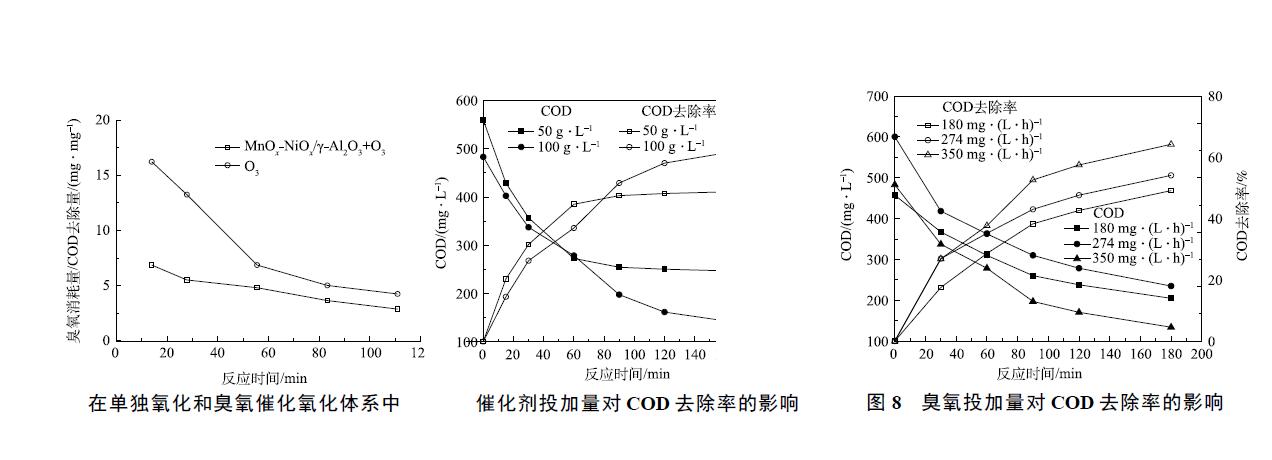 4) 通過優(yōu)化臭氧投加量和催化劑投加量發(fā)現(xiàn),催化劑投加量為100 g·L−1 廢水,臭氧投加量為350 mg·(L·h)−1 時(shí),反應(yīng)180 min 后COD 去除率能達(dá)到72.3%。